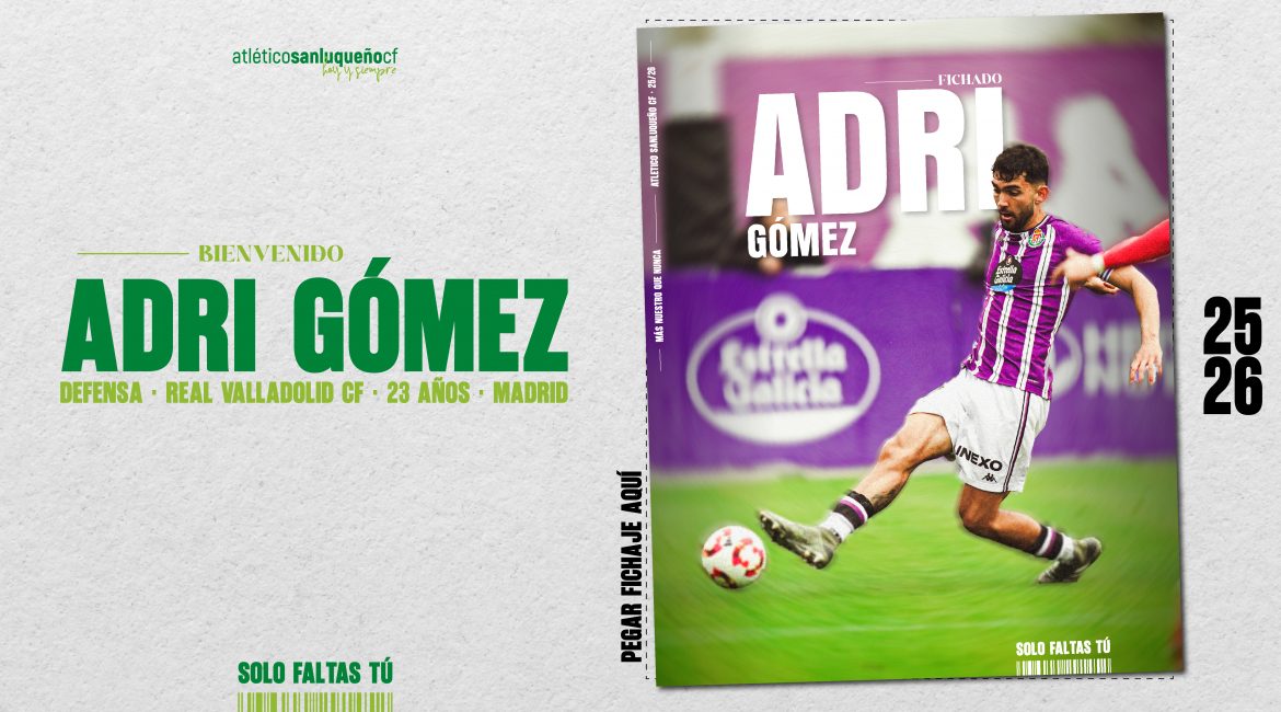 El central Adri Gómez (Madrid, 02/08/2002) se convierte en nuevo jugador del Atlético Sanluqueño CF procedente del Real Valladolid CF.