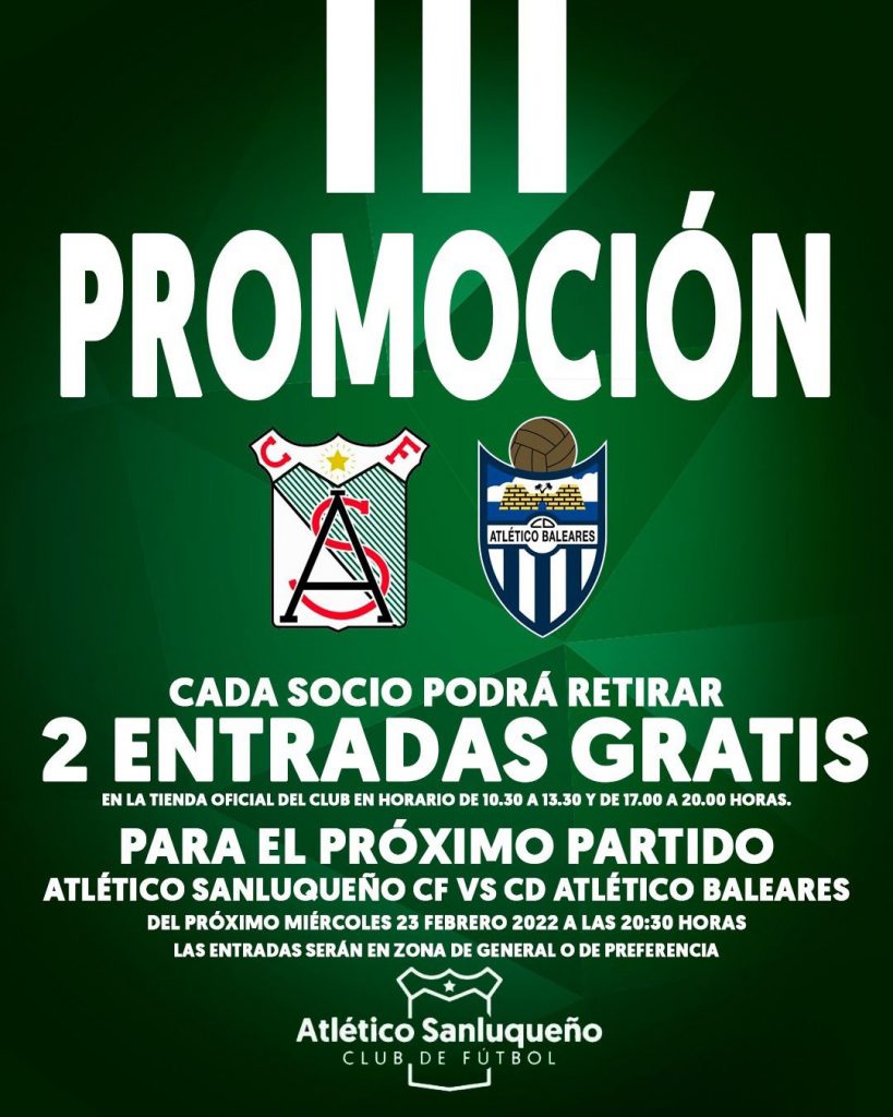 Con motivo de la celebración del partido del próximo miércoles entre el Atlético Sanluqueño y el Atlético Baleares, el club verdiblanco, consciente de la importancia del partido y sabedor de lo fundamental que es la afición para el equipo, ha decidido sacar una promoción para que acuda al estadio el mayor número posible de aficionados.